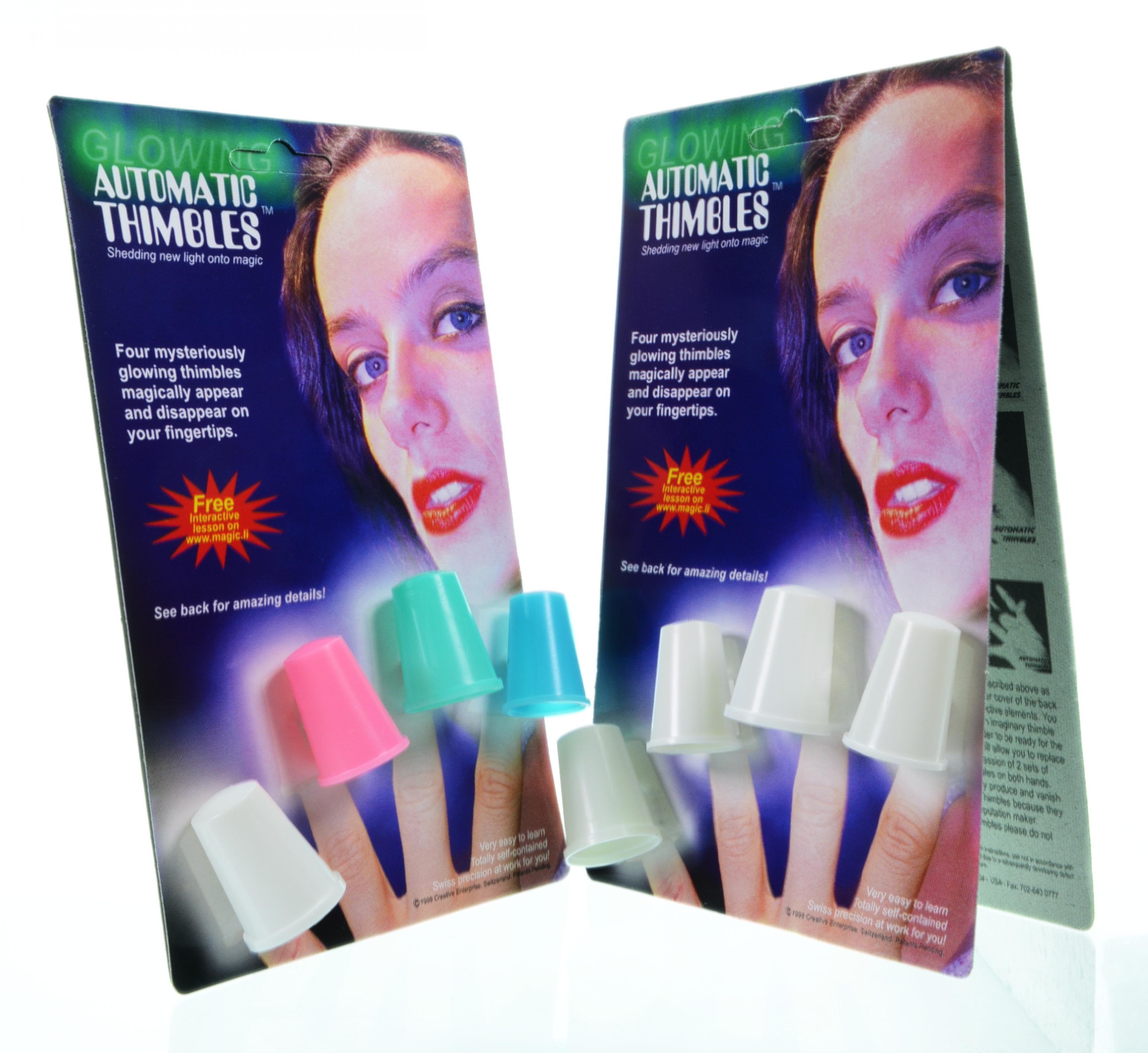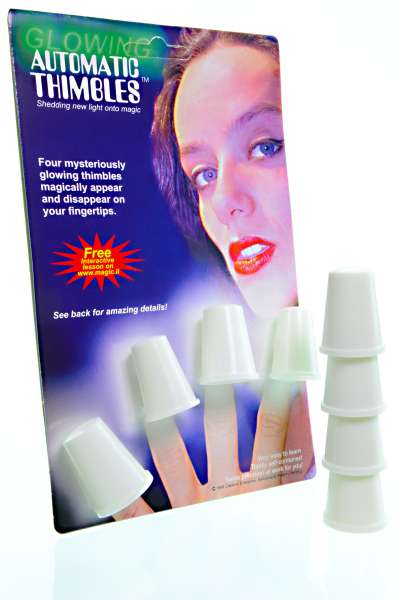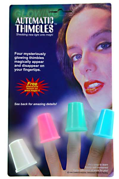 Automatic Thimbles are precision made from durable phosphorescent polymer and come in WHITE or RAINBOW COLORS. All store light, then glow in the dark and shine under UV Blacklight. Their mechanics are easy to master, allow performance under difficult conditions, and provide "hands-off-pockets" naturalism. For huge stages and small clubs alike!